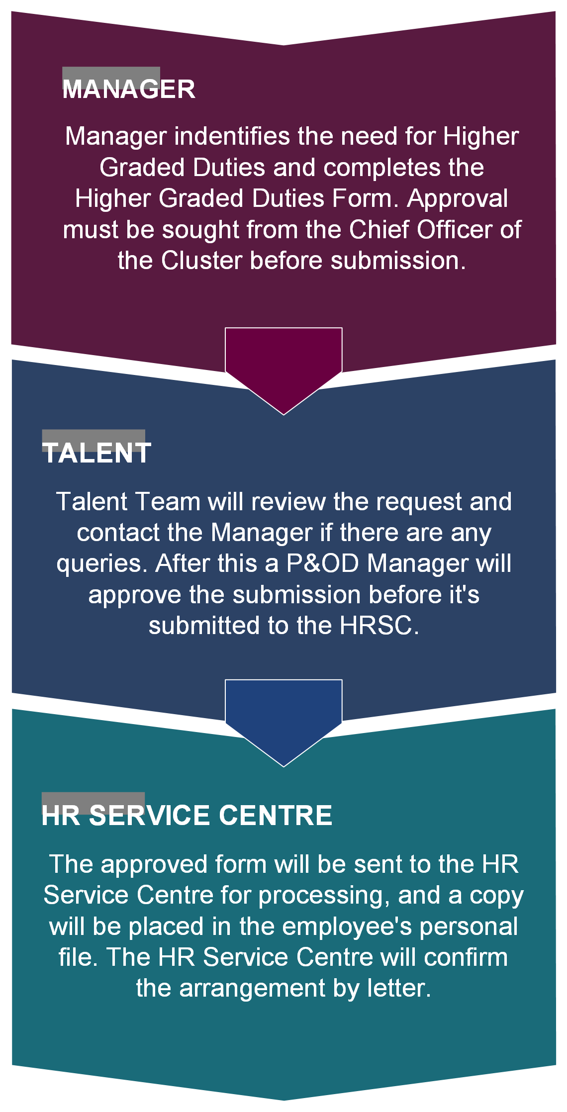 Higher graded duties should NOT be used as a substitute for the normal recruitment & selection procedure to fill a vacancy. Higher graded duties should only be used for short- term temporary circumstances such as cover for long term sickness absence, lead in time to permanent appointments being taken up or cover prior to an imminent organisational change (i.e., the change will occur within 6 months).